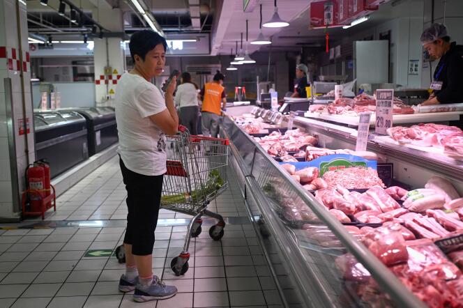 Dans un supermarché à Pékin,le 12 juin 2024. WANG ZHAO / AFP Pékin avait menacé de représailles,et elles ont commencé à tomber. Le ministère du commerce chinois a ouvert,lundi 17 juin,une enquête antidumping sur les livraisons de viande de porc européen. L’annonce intervient cinq jours seulement après que la Commission européenne a haussé les taxes douanières sur les véhicules électriques chinois,Bruxelles s’inquiétant de l’impact des subventions et surcapacités chinoises sur l’industrie automobile des Etats membres.