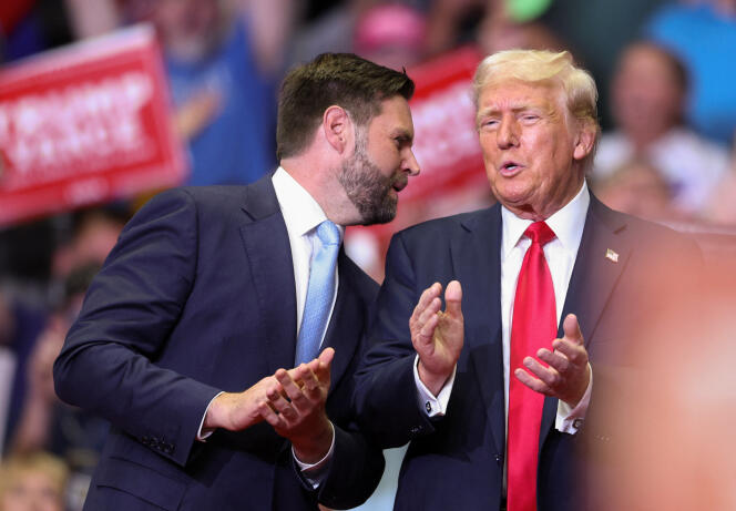Donald Trump aux côtés de son colistier,le sénateur américain J. D. Vance,à Grand Rapids (Michigan,Etats-Unis),le 20 juillet 2024. TOM BRENNER / REUTERS Il faut tout entreprendre pour renforcer le leadership des Etats-Unis dans l’intelligence artificielle (IA),semble penser Donald Trump. Lors de la convention du Parti républicain,le 19 juillet,le candidat à la présidentielle a ainsi évoqué cette technologie dans un passage de son discours consacré au « nouvel âge d’or » qu’il souhaite faire advenir − et que « tous les autres pays »,dont la Chine ou le Japon,chercheraient aussi à atteindre. « Nous devons produire des quantités massives d’énergie (…). L’IA a besoin littéralement du double de l’électricité aujourd’hui disponible dans notre pays. Vous imaginez ? »,a-t-il ainsi prévenu,sans mentionner les conséquences écologiques d’un tel boom énergétique.