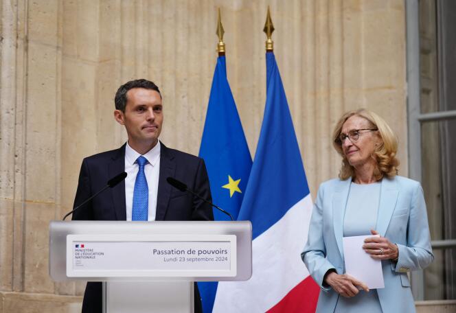 Le ministre délégué chargé de la réussite scolaire et de l’enseignement professionnel,Alexandre Portier,lors de la passation des pouvoirs avec la ministre sortante de l’éducation nationale et de la jeunesse,Nicole Belloubet,à Paris,le 23 septembre 2024. DIMITAR DILKOFF / AFP Chez Les Républicains (LR),il n’est pas le plus connu des professeurs de philosophie. Si le nom de l’eurodéputé François-Xavier Bellamy a circulé ces derniers jours pour entrer dans le gouvernement de Michel Barnier,celui d’Alexandre Portier était moins attendu. A 34 ans,le député LR du Rhône a été nommé ministre délégué chargé de la réussite scolaire et de l’enseignement professionnel – un intitulé inédit –,sous l’autorité de la ministre de l’éducation,Anne Genetet.