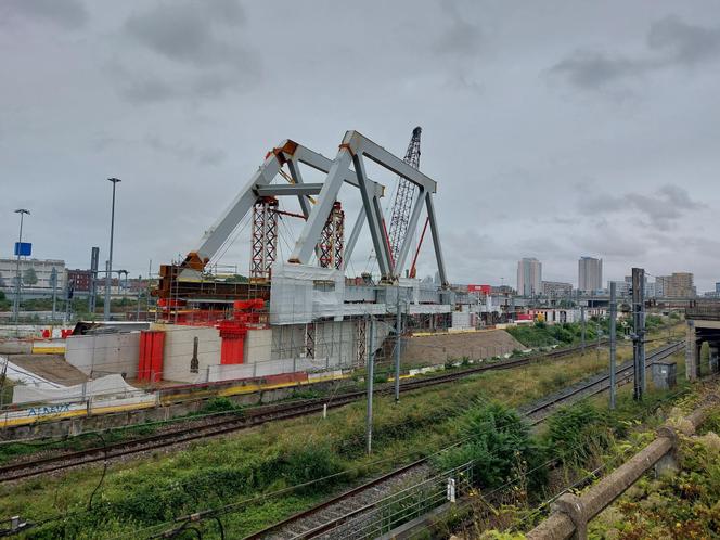 Construit en bordure des voies à Saint-Denis (Seine-Saint-Denis),le nouveau pont,d’une longueur de 143 mètres,sera inauguré en août 2025. SNCF RéSEAU IDF Il est donc là,ce pont vieux de 130 ans,objet de toutes les attentions chez SNCF Réseau depuis au moins six bonnes années,encore pour les dix mois à venir,et qui va réellement commencer à faire parler de lui,vendredi 25 octobre. Juste derrière l’échangeur de la porte de La Chapelle,au nord de Paris,bien avant l’A86,au beau milieu d’un entrelacs de rails où se croisent 1 200 trains par jour. Des RER B et D filent vers la banlieue nord,des TER vers la Picardie,des TGV destination Lille,Dunkerque,Londres,Bruxelles,Amsterdam. La même chose en sens inverse,sans oublier le fret. Cette plaine ferroviaire,qui coupe Saint-Denis (Seine-Saint-Denis) en deux,est la plus exploitée d’Europe. Et,au beau milieu,là où doit se greffer,en 2027,la navette aéroportuaire Paris-Roissy (Charles-de-Gaulle Express),il y a ce « Pont 1 » – le premier après la gare du Nord – construit en 1894,quand la tour Eiffel avait cinq ans,et qu’il faut remplacer.