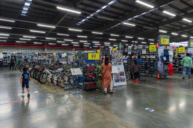 Dans un magasin Decathlon d’Uluberia (Bengale-Occidental),en Inde,le 26 octobre 2020. ALAMY STOCK PHOTO Hormis le cricket,dont on dit ici qu’il est une religion,l’Inde ne fait pas figure de grande nation du sport. Aux Jeux olympiques de Paris 2024,qui se sont déroulés du 26 juillet au 11 août,le pays de 1,4 milliard d’habitants n’a raflé que six médailles,et pas une seule en or. Pourtant,au cours des quinze dernières années,les enseignes bleu et blanc de Decathlon ont pullulé sur le territoire. Le français,arrivé en Inde en 2009,a développé un réseau de 129 magasins et emploie aujourd’hui 5 700 personnes.