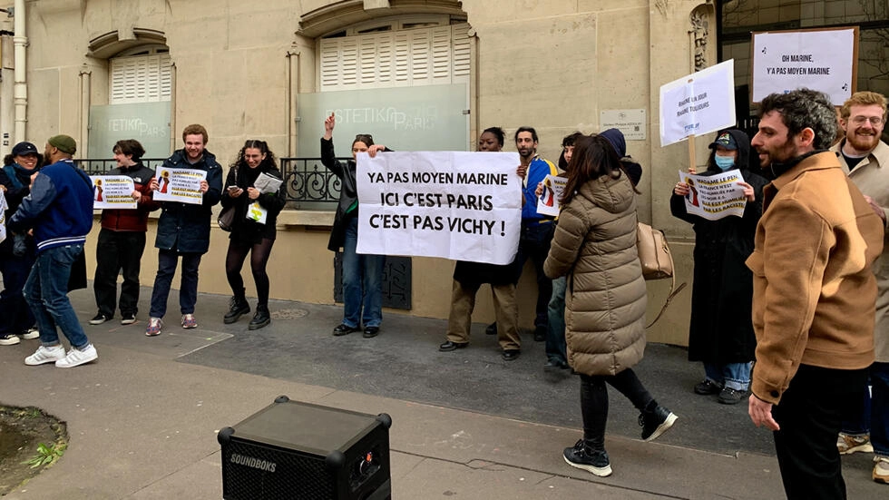 Devant un local du parti Rassemblement national dans l'ouest de Paris, porte de Saint-Cloud, une vingtaine de militants de l'association SOS Racisme se sont rassemblés, dimanche 24 mars dans l'après-midi, en soutien à la chanteuse Aya Nakamura. L'artiste est la cible d'une polémique alimentée par l'extrême droite, après des rumeurs sur sa participation à la cérémonie d'ouverture des Jeux olympiques de Paris.