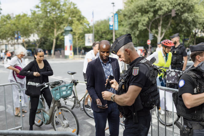 Un policier vérifie le QR code d’un pass JO,à Paris,le 23 juillet 2024. LAURENCE GEAI / MYOP POUR « LE MONDE » Des milliers de barrières ont transformé l’île de la Cité en une immense cage,située dans le périmètre « gris » protégé pour permettre les préparatifs de la cérémonie d’ouverture des Jeux olympiques de Paris du vendredi 26 juillet,dont l’accès est réservé depuis jeudi 18 juillet aux détenteurs d’un sésame : le Pass Jeux et son QR code. Ce périmètre,aussi appelé périmètre « SILT »,du nom de la loi de lutte contre le terrorisme qui le rend possible,est particulièrement restrictif,et s’étend sur les bords de Seine,sur près de six kilomètres. Au moment où le périmètre entrait en vigueur,300 000 passes avaient été distribués,notamment aux résidents et travailleurs qui ont dû en faire la demande.