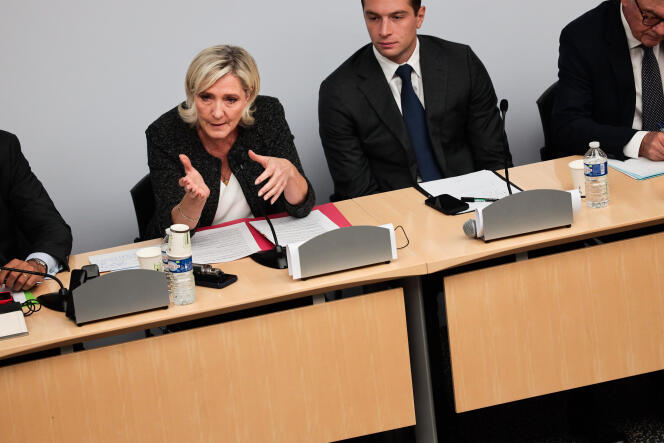 La cheffe de file des députés du Rassemblement national (RN),Marine Le Pen,lors de la rentrée des parlementaires RN,à Paris,le 14 septembre 2024. CYRIL BITTON/DIVERGENCE POUR « LE MONDE » Réserver les emplois aux Français : la promesse figure en bonne place dans le programme du Front national,devenu le Rassemblement national (RN),depuis plus de quarante ans. « Un million de chômeurs,c’est un million d’immigrés de trop ! La France et les Français d’abord ! »,affichaient,dès 1978,les troupes de Jean-Marie Le Pen. Sa fille Marine a,depuis,pris les rênes et renommé le parti d’extrême droite,sans renoncer à l’application de la « préférence nationale » au monde du travail. « Le Français est chez lui,justifiait-elle,en 2021. Il faut permettre aux employeurs de donner en priorité accès à l’emploi à un Français. »