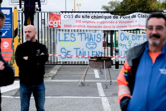 Les salariés de l’entreprise Vencorex en grève,devant les locaux de Pont-de-Claix (Isère),le 24 octobre 2024. BENOIT PAVAN / BENOIT PAVAN Les visages sont tendus,tournés vers la scène du foyer municipal de Pont-de-Claix (Isère). Mercredi 23 octobre,environ 200 salariés de Vencorex attendent la prise de parole des syndicats,au surlendemain du délai fixé pour déposer les offres de reprise de l’entreprise,détenue par le groupe pétrochimique thaïlandais PTT GC et placée en redressement judiciaire depuis plus d’un mois. « Vous le savez sûrement tous déjà,mais il n’y a qu’une seule offre »,lâche au micro Séverine Dejoux,élue du comité social et économique (CSE) de Vencorex.