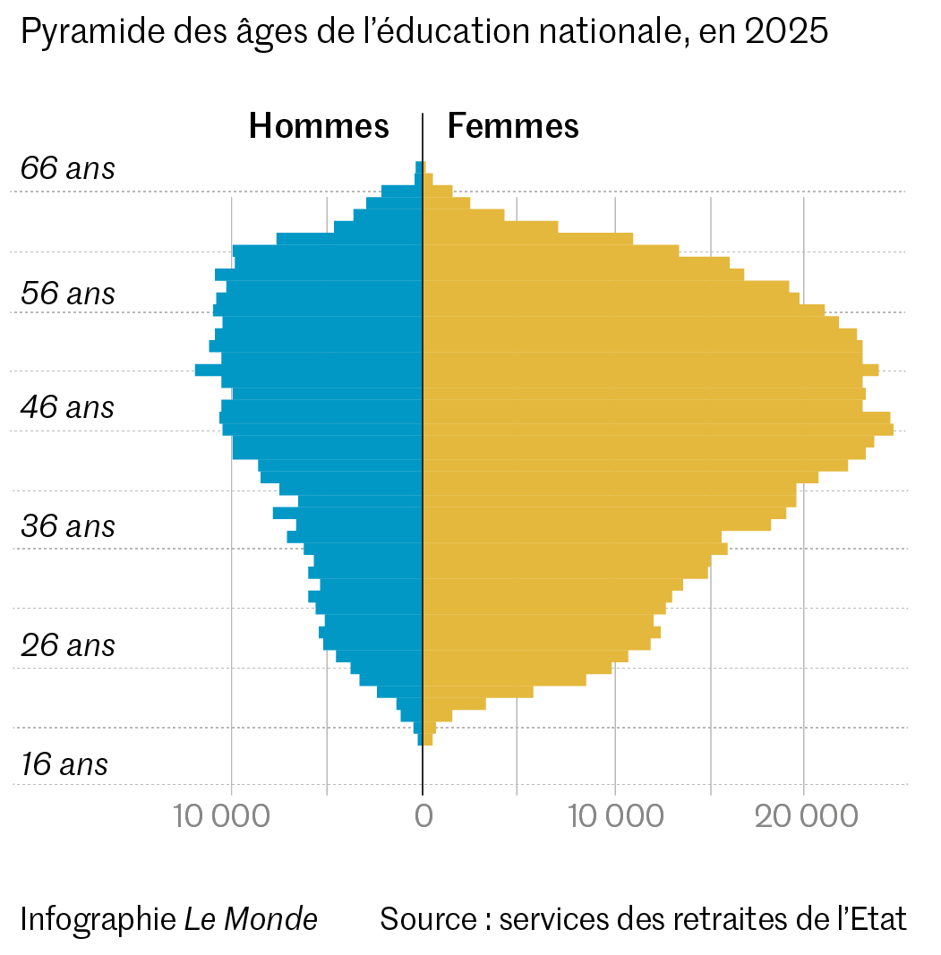 La pyramide des âges dans le plus gros corps de la fonction publique est déjà « particulièrement vieillissante » et les projections laissent à voir une dégradation sur au moins les deux prochaines décennies,au point que l’institution de la rue Cambon qualifie la situation de l’éducation nationale « d’inquiétante ».