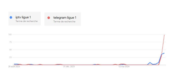 Evolution des recherches sur Google,depuis un an,pour des moyens de regarder illégalement des matchs de Ligue 1. Sur Google Trends,l’outil qui permet de comparer l’évolution du nombre de recherches sur des mots-clés,les courbes sont impressionnantes : mi-août,le nombre de recherches pour des outils permettant de regarder illégalement la reprise du championnat de Ligue 1 a explosé. Cause probable de cette soudaine hausse,l’annonce officielle des tarifs de DAZN,le 8 août : le nouveau détenteur des droits du championnat propose un abonnement à 29,99 euros par mois,avec un engagement d’un an,soit environ le double du tarif du Pass Ligue 1 proposé en 2023 par Amazon,en comptant le prix d’un abonnement Prime Video.