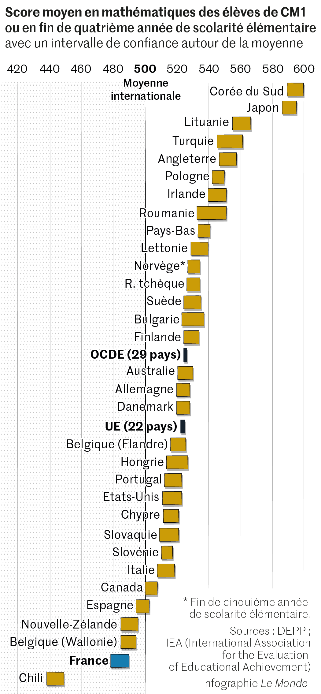 Avec un score de 484 points pour les élèves de CM1,contre 524 points en moyenne dans l’Union européenne,la France est bonne dernière d’Europe,juste derrière la Belgique francophone. Elle est également avant-dernière de l’Organisation de coopération et de développement économiques (OCDE),devant le Chili. En classe de 4e,les Français obtiennent une moyenne de 479 et sont donc avant-derniers d’Europe,devant le Portugal – et toujours avant-derniers,devant le Chili,pour le reste de l’OCDE. Les pays les plus performants restent Singapour,Taïwan,le Japon et la Corée du Sud.