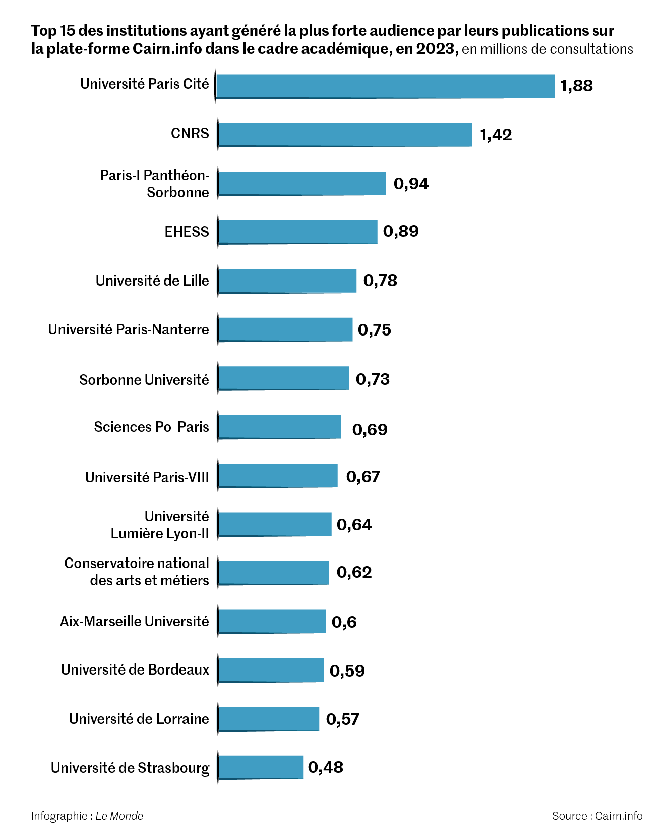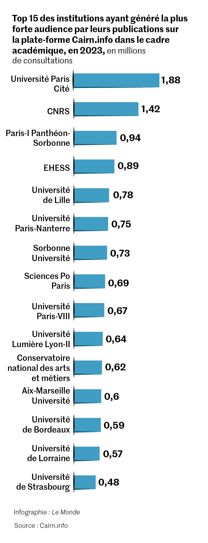 Alors que sort,jeudi 15 août,l’édition 2024 du classement de Shanghaï,Le Monde a voulu tenter de prendre le contre-pied de cette standardisation académique en explorant la vie des idées produites en français dans le domaine des sciences humaines et sociales : histoire,science politique,sociologie,psychologie,philosophie,économie… Laplate-forme Cairn.info,qui comptabilise près de 400 000 articles en ligne et 282 millions de consultations au sein des institutions académiques depuis sa création,en 2005,nous livre pour la première fois,et en exclusivité,le détail de ses données. Elles permettent de dresser le palmarès des thématiques et des établissements ayant généré au cours de l’année 2023 le plus de lectures au sein des universités du monde entier.