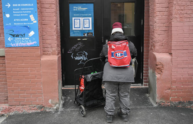 A l’entrée de la banque alimentaire de l’association Mission Bon Accueil,à Montréal,Québec,au Canada,le 1ᵉʳ décembre 2023. GRAHAM HUGHES / BLOOMBERG VIA GETTY IMAGES En ce lundi du mois d’août,un peu avant 13 heures,les premières personnes patientent devant les portes du Patro Roc-Amadour. Munies de sacs,elles attendent que la distribution alimentaire proposée par cet organisme d’entraide sociale implanté depuis soixante-quinze ans dans le quartier populaire de Limoilou,à Québec,débute.