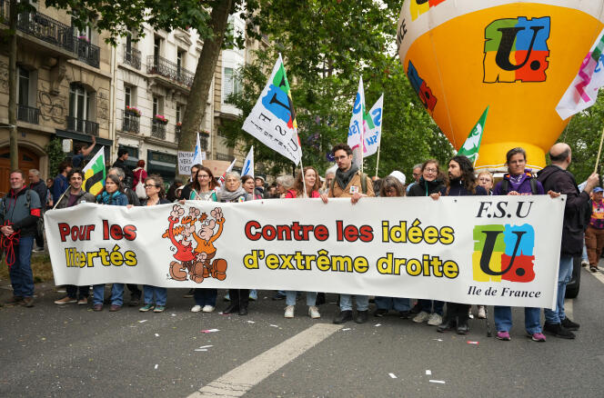 Des manifestants tiennent une banderole syndicale « Pour les libertés et contre les idées d’extrême droite - FSU Ile de France »,lors d’un rassemblement contre l’extrême droite,à Paris,le 15 juin 2024. ZAKARIA ABDELKAFI / AFP Quel est le périmètre du devoir de réserve des fonctionnaires,en période électorale ? Des courriers émanant de cabinets de rectorat ou de directeurs académiques des services de l’éducation nationale (Dasen) ont suscité l’émoi parmi le personnel de l’éducation nationale,depuis l’annonce de la tenue d’élections législatives anticipées,dimanche 9 juin. Adressés aux inspecteurs et aux chefs d’établissement,ils expliquent que les fonctionnaires sont tenus jusqu’au scrutin de « s’abstenir de participer à toute manifestation ou cérémonie publique de nature à présenter un caractère électoral ».