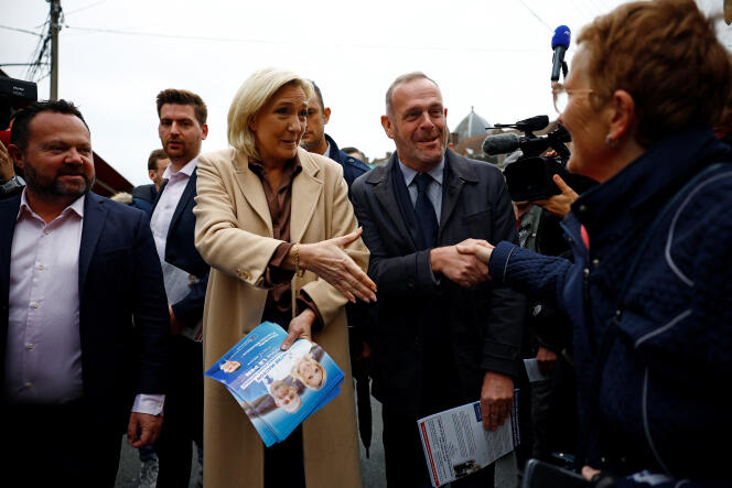 Marine Le Pen en campagne avec Steeve Briois (à droite),au marché d’Hénin-Beaumont (Pas-de-Calais),le 14 juin 2024. SARAH MEYSSONNIER / REUTERS Quatre cadres du Front national (FN) – à l’époque,ce n’était pas encore le Rassemblement national (RN) – ont été jugés,mardi 18 juin,à Nanterre,pour « provocation à la discrimination nationale »,dont Steeve Briois,maire d’Hénin-Beaumont (Pas-de-Calais) et toujours suppléant de la députée sortante Marine Le Pen,Jean-François Jalkh,l’un des premiers députés du FN de 1986,Sophie Montel,qui a claqué la porte en 2017 après vingt ans au parti,pour rejoindre Florian Philippot,et,enfin,Marie-Thérèse Costa-Fesenbeck,éphémère présidente du RN à Perpignan. Aucun n’était présent. Le cas de Jean-François Jalkh a été disjoint : à la suite d’une attaque cérébrale,il est paralysé et ne peut plus parler. Il sera jugé le 3 juin 2025,si son état le permet.