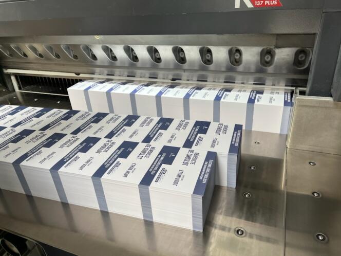 Coupe des bulletins de vote à l’imprimerie Centr’Imprim,à Issoudun (Indre),vendredi 14 juin. CENTR’IMPRIM Quand ils ont appris la dissolution de l’Assemblée nationale et les dates des scrutins,fixées au 30 juin et au 7 juillet,les imprimeurs ont eu une réaction presque unanime : comment,dans un délai aussi court,livrer en temps et en heure dans les 577 circonscriptions toute la propagande électorale des candidats constituée par les professions de foi et les bulletins de vote ? « Le délai exigé entre la fin du dépôt des candidatures [dimanche 16 juin] et la livraison du matériel électoral imprimé [mardi 18 juin,à 18 heures] apparaît trop court »,a aussitôt prévenu l’Union nationale des industries de l’impression et de la communication (Uniic).