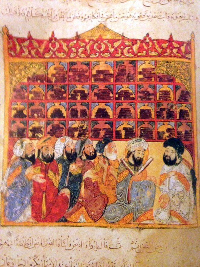Savants dans une bibliothèque abbasside. Enluminure du XIIIᵉ siècle. SCIENCE HISTORY IMAGES/ALAMY « L’Arrivée de l’homme en Islam et sa disparition. D’Athènes à Bagdad »,de Houari Touati,Vrin,« Etudes musulmanes »,512 p.,55 €.