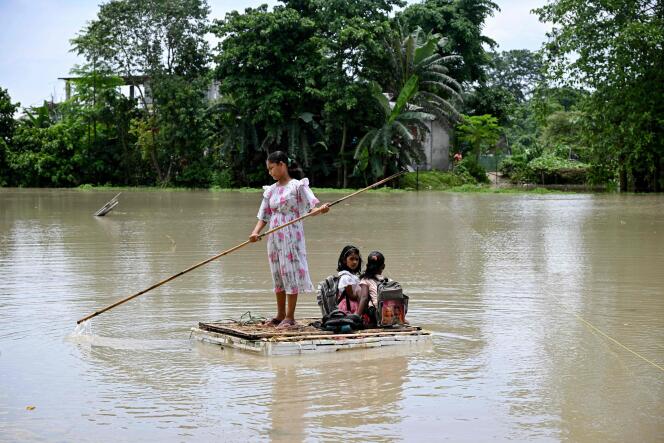 A la suite d’inondations dans le village de Mayong,dans le nord de l’Inde,le 3 juillet 2024. BIJU BORO / AFP C’est une simple ligneinscrite au programme du Nouveau Front populaire (NFP) à l’issue de quatre jours de négociations au pas de course : « créer un statut de déplacé climatique ». Mais derrière cette proposition,l’une des douze listées par le bloc de gauche pour « garantir un accueil digne » aux personnes migrantes,se cacheun enjeu de gouvernance jugé urgent.