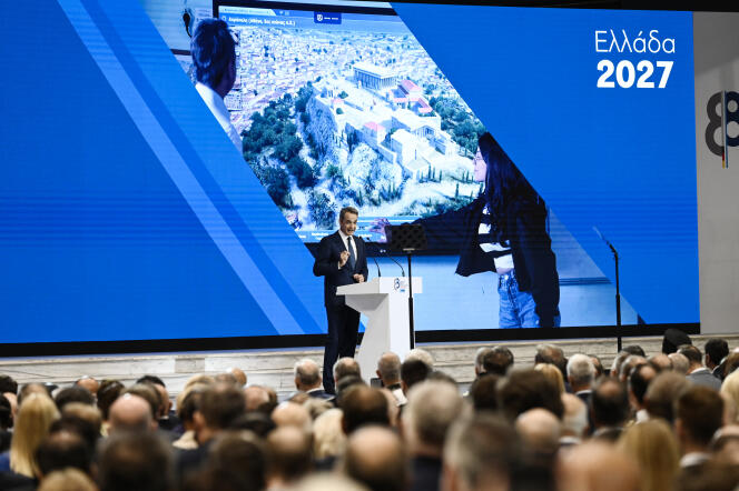 Le premier ministre grec Kyriakos Mitsotakis,à Thessalonique (Grèce),le 7 septembre 2024. SAKIS MITROLIDIS / AFP « Notre but est que jusqu’en 2027 la Grèce rattrape le terrain perdu pendant l’époque des mémorandums [plans d’austérité durant la crise financière de 2010 à 2018],et que la prochaine génération puisse vivre mieux que la précédente »,a affirmé,samedi 7 septembre,depuis la tribune de la Foire internationale de Thessalonique,le premier ministre grec,Kyriakos Mitsotakis.