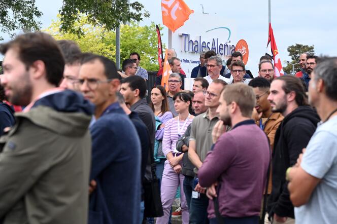 Rassemblement des salariés de Thales Alenia Space sur le site de Toulouse,mardi 17 septembre 2024. REMY GABALDA / MAXPPP Entré chez Thales Alenia Space (TAS) en 1996,Guilhem Ganivet,syndiqué à Force ouvrière,n’a pas souvenir d’avoir connu un plan de restructuration d’une telle ampleur. « C’est inédit et l’heure est grave »,se navre ce technicien,micro à la main,devant 700 salariés rassemblés à l’appel d’une intersyndicale FO,CFE-CGC,CFDT,CGT,sur le terre-plein à l’entrée de l’usine toulousaine,mardi 17 septembre. « Ce plan est débile et incohérent car notre charge de travail est établie jusqu’à la fin 2025. On réclame son arrêt pur et simple et on ne lâchera rien. »