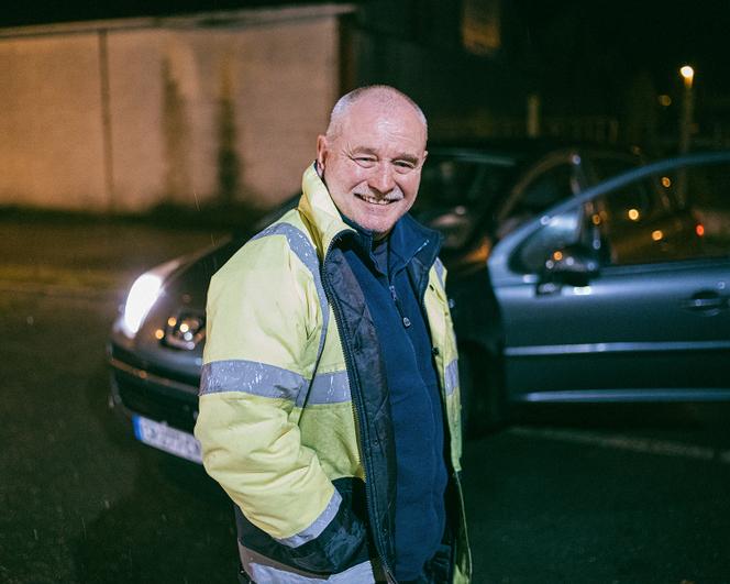 Stéphane Gaudin,porteur de journaux dans la région de Dinan (Côtes-d’Armor),lors de sa tournée,le 9 octobre. JEAN-MATTHIEU GAUTIER / HANS LUCAS POUR M LE MAGAZINE DU MONDE Les tubes s’enchaînent sur les ondes de Radio Décibel dans le silence de la nuit. « J’aime mieux écouter ça que les gens qui parlent tout le temps »,commente Stéphane Gaudin au volant de sa Peugeot 206 fatiguée. L’horloge a sonné 4 heures et dans les rues peu éclairées de Dinan (Côtes-d’Armor),le conducteur s’arrête. Il attrape un exemplaire d’Ouest-France sur le siège passager,saute de sa voiture et dépose le journal dans une boîte aux lettres. Il remonte,valide l’opération sur son téléphone et repart pour s’arrêter une dizaine de mètres plus loin. « Quand je peux,je me gare juste devant la boîte aux lettres,comme ça,je n’ai qu’à tendre le bras. Je suis un fainéant,moi »,s’esclaffe le sexagénaire emmitouflé dans une veste jaune fluo. Ce mercredi matin,il a cent soixante-cinq exemplaires à distribuer.