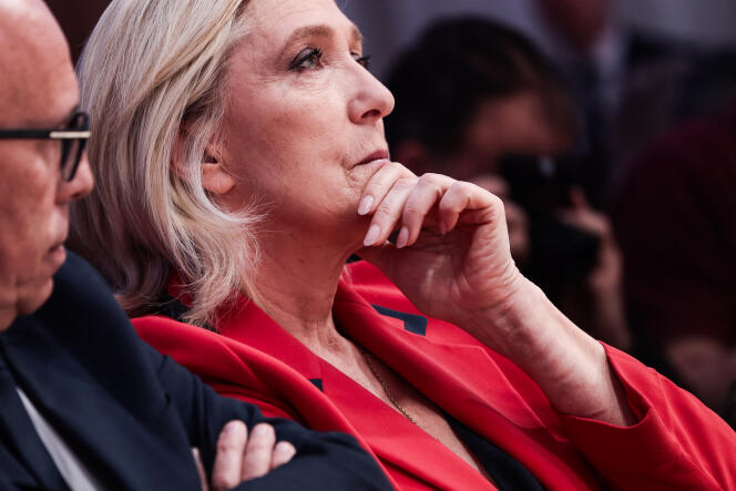 Paris le 24 Juin 2024. Conférence de presse de Jordan Bardella qui orésente son programme // Eric Ciotti et Marine Le Pen CYRIL BITTON / DIVERGENCE POUR « LE MONDE » Des décennies d’antisémitisme ne s’effacent pas d’un trait de plume. Une semaine après que Marine Le Pen a publié une tribune,le 22 juin,dans Le Figaro,où elle affirme n’avoir « jamais toléré » d’idées antisémites ou révisionnistes au sein du Rassemblement national (RN),l’entourage de la leader d’extrême droite s’étonne que le texte n’ait eu aucun écho. « Même les médias qui nous aiment bien n’en ont pas parlé »,souffle Louis Aliot,maire de Perpignan et artisan du rapprochement du Front national (FN,devenu RN) avec la communauté juive. La déception est à la hauteur de l’effort consenti à l’écrit par la triple candidate à la présidentielle,prête à réviser le passé de son parti d’extrême droite pour s’ériger en « meilleur rempart » contre l’antisémitisme.