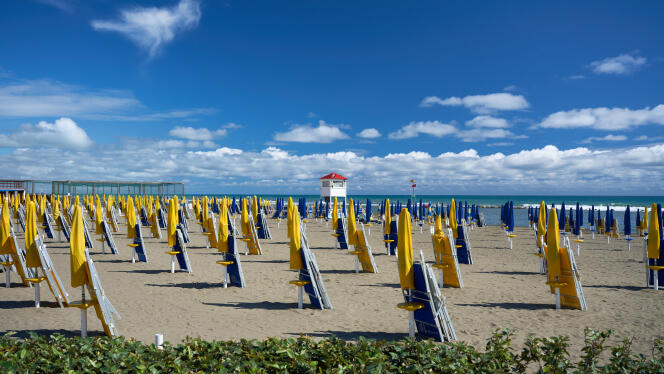 La plage de Marinella,près d’Ostie,le 17 mai 2023. RADEK KUCHARSKI/CC BY 2.0 La plage de la Marinella est en grève. Au matin du vendredi 9 août,comme des centaines d’autres exploitants balnéaires,Emiliano Migliore,39 ans,a retardé l’ouverture de ses 250 parasols,parfaitement alignés sur la bande de littoral proche d’Ostie dont sa famille a la garde depuis 1980. Les baigneurs,qui commencent habituellement à se presser sur le sable gris dès 8 heures,devront patienter.