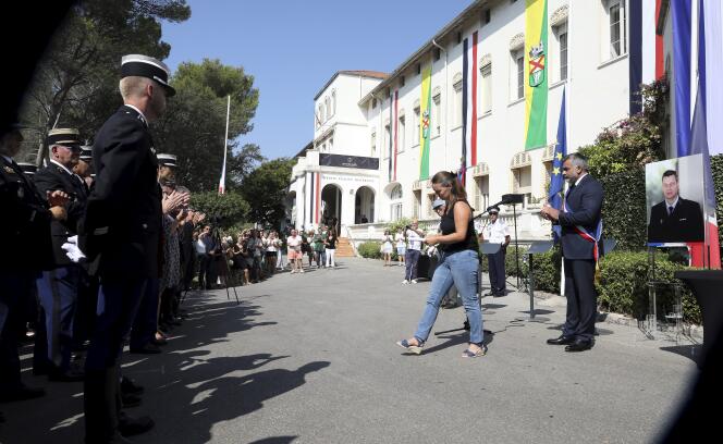 Harmonie Comyn,épouse de l’adjudant de gendarmerie tué par un chauffard à Mougins,lors de l’hommage à son mari,sur le parvis de l’Hôtel de Ville de Mandelieu-la-Napoule (Alpes-Maritimes),le 28 août 2024. PATRICE LAPOIRIE / MAXPPP « Je l’affirme haut et fort : la France a tué mon mari. » A l’occasion de l’hommage rendu à son défunt mari à Mandelieu-la-Napoule (Alpes-Maritimes),au milieu de sanglots étranglés,Harmonie Comyn a dénoncé l’« insuffisance »,le « laxisme » et « l’excès de tolérance » responsables,selon elle,de sa mort. Agé de 54 ans,l’adjudant Eric Comyn a été tué à la suite d’un refus d’obtempérer le lundi 26 août,à l’occasion d’un contrôle routier sur l’autoroute A8 à hauteur de Mougins (Alpes-Maritimes).