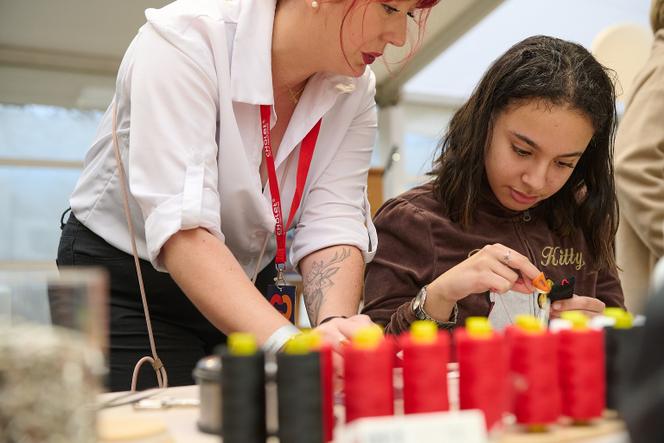 Les doigts tachés d’encre rouge,après avoir badigeonné un porte-étiquette de valise,Raziella Cailleau dit ne pas vouloir « faire ça,comme métier ». A 13 ans,elle se voit « être styliste ». Lola Raboin se destine,elle aussi,à cette fonction « qui fait rêver »,mais elle sait qu’elle rejoindra d’abord un atelier de confection. Cette lycéenne de 16 ans,en baccalauréat professionnel dans la filière des métiers de la mode et du vêtement,à Cholet,est là « pour obtenir un stage chez Chanel en 2026 ». Depuis le début de la matinée,elle gravite autour de Denis Ridard,ancien chef de l’atelier galon de la maison de luxe,venu,dé au doigt,susciter des vocations.