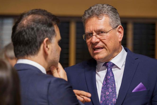 Le commissaire européen au commerce,Maros Sefcovic,à droite,échange avec le ministre du commerce extérieur français,Laurent Saint-Martin au Luxembourg,le 7 avril 2025. JEAN-CHRISTOPHE VERHAEGEN / AFP Dans l’affrontement qui les oppose à Donald Trump au sujet des droits de douane,les Européens semblent toujours avoir un train de retard. Quand le président américain aligne à un train d’enfer les annonces,Paris,Berlin,Rome et les autres doivent en effet d’abord s’entendre,avant que la Commission,compétente en matière de commerce,puisse avancer ses pions. Et,pour un peu que la Maison Blanche fasse soudainement marche arrière,l’Union européenne (UE) peut vite se retrouver à contretemps,obligée d’ajuster dans l’urgence sa stratégie,au risque d’en brouiller la lisibilité.
