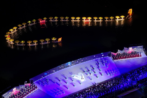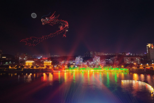 More than 2000 drone formations, along with the Cold Flame Waterfall and high-altitude fireworks, painted a colorful scroll on site. The Water Spider Man, carrying the Fire Pot Iron Flower, broke through the water and soared into the air, which was amazing.