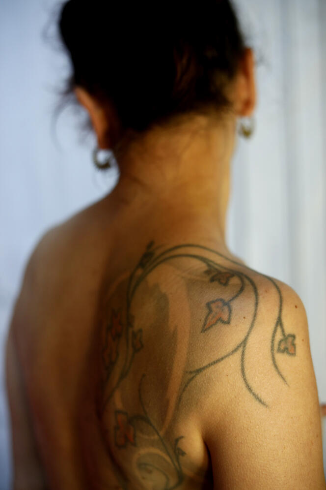 Sandra Matias,à son domicile de Saint-Pal-de-Chalencon,en Haute-Loire,le 5 juin 2024. SARAH BALHADÈRE POUR « LE MONDE » Retrouvez tous les épisodes de la série « Tattoo & Moi » ici