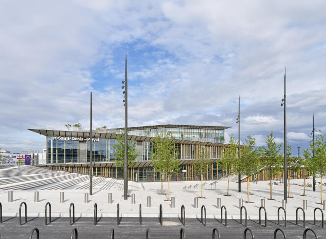 Qu’en est-il en réalité,alors que la gare Saint-Denis-Pleyel devrait être inaugurée par Emmanuel Macron,lundi 24 juin ? La silhouette qui se profile depuis la partie ouest de Saint-Denis se distingue par ses volumes empilés (sur quatre niveaux) avec de légers décalages,comme des soufflets que l’on aurait imbriqués les uns dans les autres. Un grand emmarchement qui s’élève en pente douce depuis une esplanade très minérale,même si plantée de petits arbres,une rampe qui le prolonge dans le sens opposé pour rejoindre,à 9 mètres au-dessus du sol,l’entrée de la station et la passerelle qui file jusqu’à l’entrée du RER lui confèrent une certaine dynamique. Mais l’effet est d’ordre visuel. Les boîtes ont beau se rétrécir à mesure que l’on s’élève,pivoter de quelques degrés les unes sur les autres,se projeter en porte-à-faux,se draper dans des enveloppes en forme d’origami,tout en lignes brisées,la structure orthogonale ne ment pas. Sa massivité renvoie au registre du mirage la légèreté que nous vendaient les images.