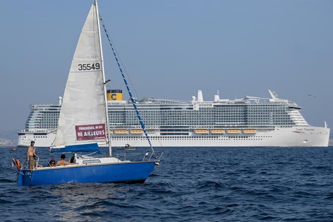 Des militants du collectif Stop Croisières arborent une banderole sur un voilier pour protester contre les bateaux de croisière,alors que le « Costa Toscana » (au second plan) quitte le port de Marseille,dans le sud de la France,le 17 juin 2023. NICOLAS TUCAT/AFP Le bilan que prévoit d’atteindre le secteur de la croisière à Marseille pour 2024 ? 590 escales pour près de 2,5 millions de passagers. Des chiffres en léger recul par rapport au record de 2023 (626 escales),mais un volume qui témoigne du poids économique de l’activité touristique,laquelle soulève toujours de vives oppositions au niveau local.