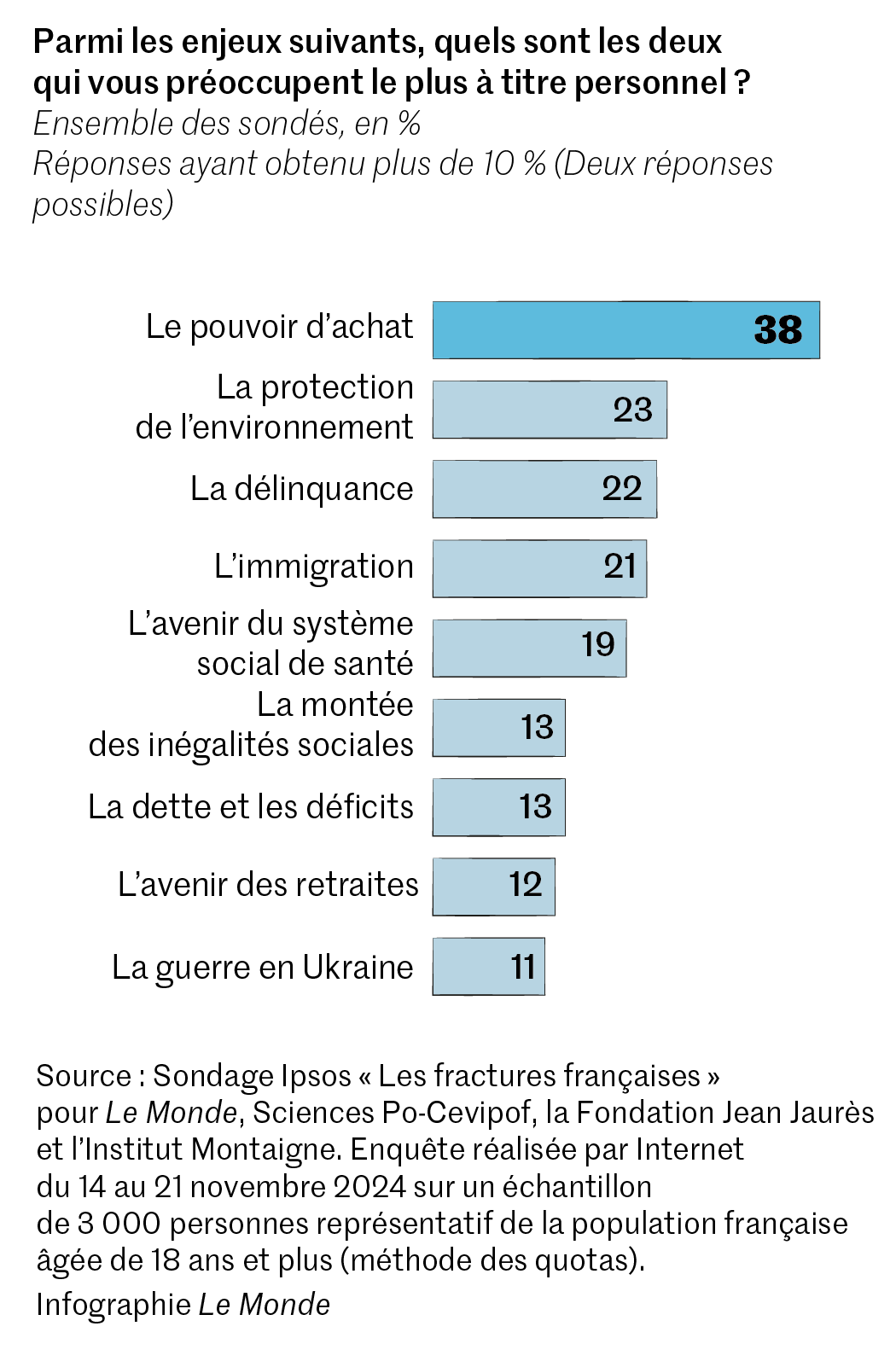 La crise politique invoquée par Emmanuel Macron pour justifier sa dissolution n’a pas été enrayée. Pire,elle semble plus aiguë encore qu’il y a un an. C’est l’un des enseignements de la douzième vague de l’étude « Fractures françaises »,réalisée par Ipsos pour Le Monde,la Fondation Jean Jaurès,le Centre de recherches politiques de Sciences Po (Cevipof) et l’Institut Montaigne,du 14 au 21 novembre auprès d’un panel de 3 000 personnes. « Le chaudron bouillonne »,résume Brice Teinturier,le directeur général délégué d’Ipsos,qui souligne une corrélation particulière,cette année,entre la « sphère personnelle et la sphère politique ».