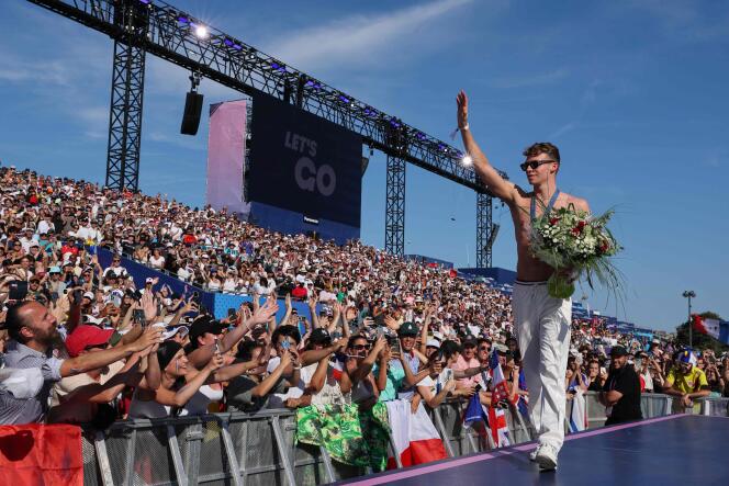 Celui qui ouvre le bal,mardi 6 août à 17 h 45,est le quadruple médaillé d’or et nouveau héros des Français,Léon Marchand. La foule,en délire,scande « Lé-on,Lé-on » pour le nageur toulousain,torse nu sous 29 °C. Il est rejoint par le reste de l’équipe du relais masculin français du 4 × 100 m 4 nages qui a décroché dimanche 4 août la médaille de bronze. Florent Manaudou prend le micro pour remercier la bienveillance du public. Un clapping est lancé,La Marseillaise retentit.