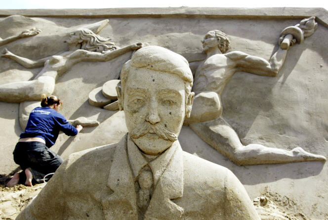 Sculpture de sable de Pierre de Coubertin,par Maaike Huizinga,dans le « Stade olympique de Travemuende »,à Luebeck (Allemagne),le 6 juillet 2004. HERIBERT PROEPPER / AP La chapelle de l’Epiphanie,dans le 7e arrondissement de Paris,abrite un tableau qui en dit long sur le berceau familial de Pierre de Coubertin (1863-1937),fondateur,en 1894,du Comité international olympique (CIO) et considéré comme le père des Jeux olympiques (JO) modernes.
